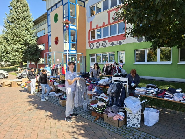 Bereits um 11 Uhr begann der Aufbau – Tische und Bänke wurden durch Mitarbeitende des Bauhofs Wutha geliefert. Danach sortierten die Schüler*innen und Helfer die zahlreichen Spenden, zu denen Kleidung, Schuhe, Spielsachen, Babyzubehör, Geschirr und Wohnaccessoires gehörten. Die Spenden wurden zuvor von Lehrerinnen der Regelschule sowie von Bürgerinnen und Bürgern aus Eisenach, Wutha, Thal und Seebach zur Verfügung gestellt.