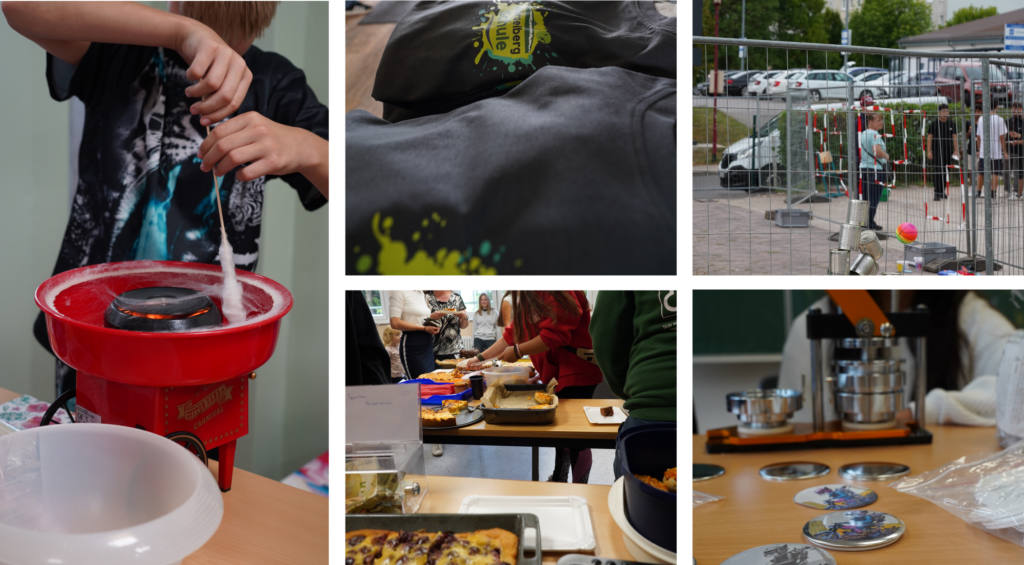 Für das leibliche Wohl sorgten ein reichhaltiger Kuchenbasar und vor allem die frisch gegrillten Bratwürste von der Fleischerei Fischer, wofür die Schule herzlich dankte. Der Förderverein, vertreten durch Frau Dagmar Schmidt, Herrn Kranz und die ehemalige Kollegin Frau Lohmann begrüßten die Gäste im Eingangsbereich und warben nicht nur fleißig für die Mitgliedschaft im Förderverein. Erstmals konnten zudem die neuen Schul-T-Shirts erworben werden – ein Angebot, das noch zaghaft angenommen wurde, jedoch machten die Lehrkräfte schon eine super Figur darin.