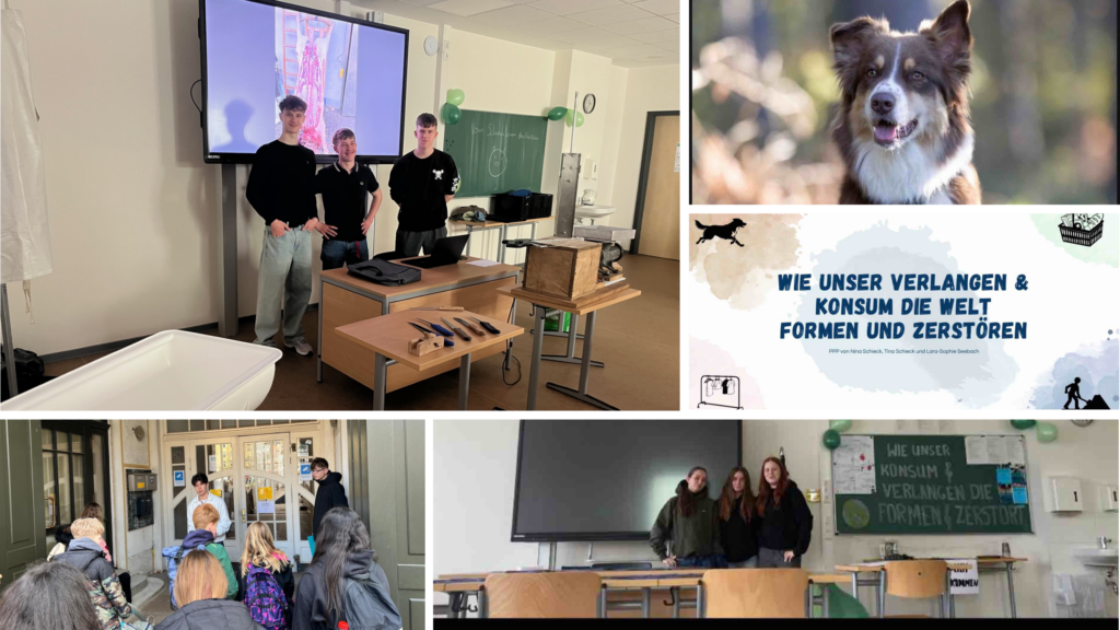 Eine Gruppen beschäftigten sich mit den Auswirkungen unseres Konsums und untersuchten dabei Aspekte wie Tierwohl in der Lebensmittelproduktion und Lebensmittelverwertung, die Problematik von Fast Fashion sowie Fragen einer gesunden und nachhaltigen Ernährung. Ein besonderer Schwerpunkt lag hierbei auf einem praktischen Teil, der in Form von drei spannenden Projekttagen in Klasse 8 umgesetzt wurde. Dabei konnten die Schülerinnen und Schüler ihre Erkenntnisse weitergeben und erlebbar machen – unterstützt wurden sie unter anderem von Hündin „Bubbles“, die die Präsentation auf besondere Weise bereicherte.