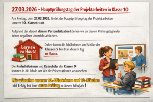 Information: Am Freitag, 27.03.26 finden die Projektarbeitsprüfungen der Klasse 10 statt. An diesem Tag bleiben alle Klassen bis auf die Klassen 9 und 10 zu Hause und erhalten Aufgaben von ihren Fachlehrern.